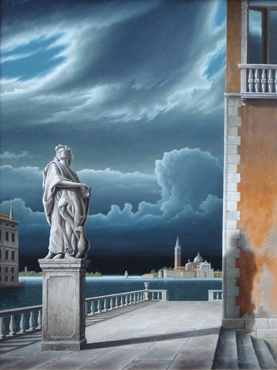 Boven: In de wolken, olieverf op paneel, 12 x 16 cm.