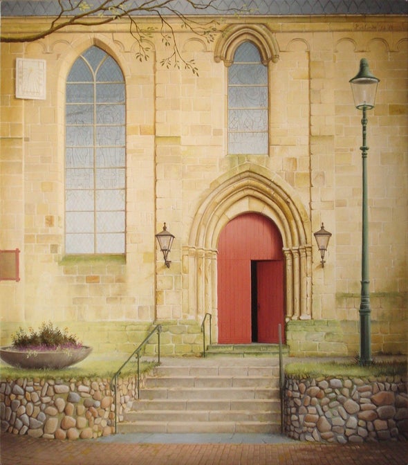 Boven: Zij-ingang van de kerk in Ootmarsum, olieverf op paneel, 29 x 25 cm.